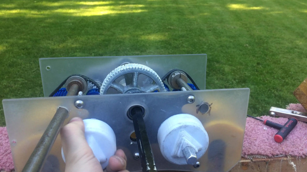 The plan was to have the lower two wheels of the triangle powered by cim motors located in the custom transmission. When the wheel reaches an obstacle the axles powering the lower wheels are retracted. When that happens, motor power is shifted to rotating the whole wheel assembly.